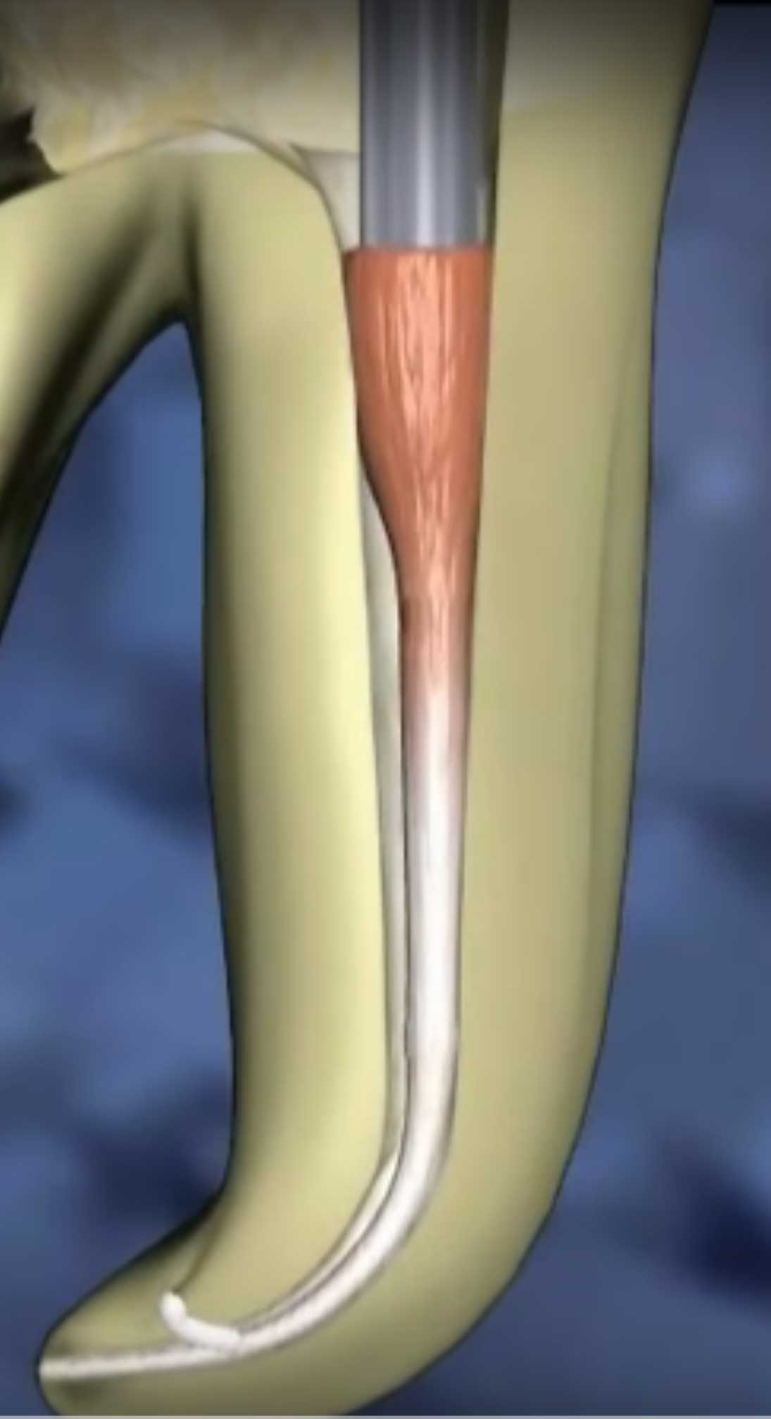 - Insert the heated plugger into the canal whilst activated, applying firm pressure – stop 1mm from the marked stopper.